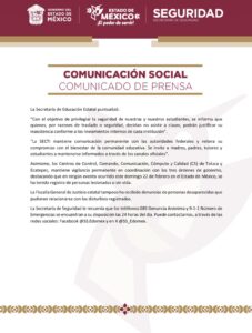 La decisión la tomaron la Secretaría de Seguridad del Edomex y la Secretaría de Educación, Ciencia, Tecnología e Innovación (SECTI), y aplica para todos los niveles educativos en los siguientes 14 municipios: Axapusco, Huehuetoca, Donato Guerra, San José del Rincón, Jilotepec, San Antonio la Isla, Villa de Allende, Xonacatlán, Polotitlán, Tultitlán, Tecámac, Coacalco, Chalco y Hueypoxtla.